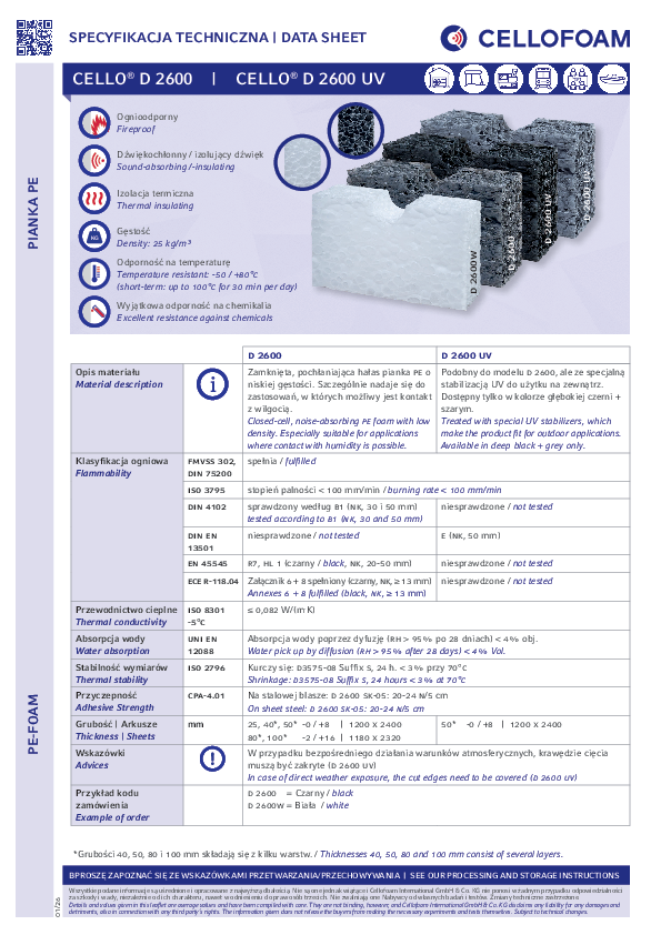 Zamkniętokomórkowa pianka z właściwościami wyciszająco-pochłaniającymi. Zaletą Cello® D 2600 jest wysoka stabilność oraz dobra odporność na wilgoć, mróz i zabrudzenia.