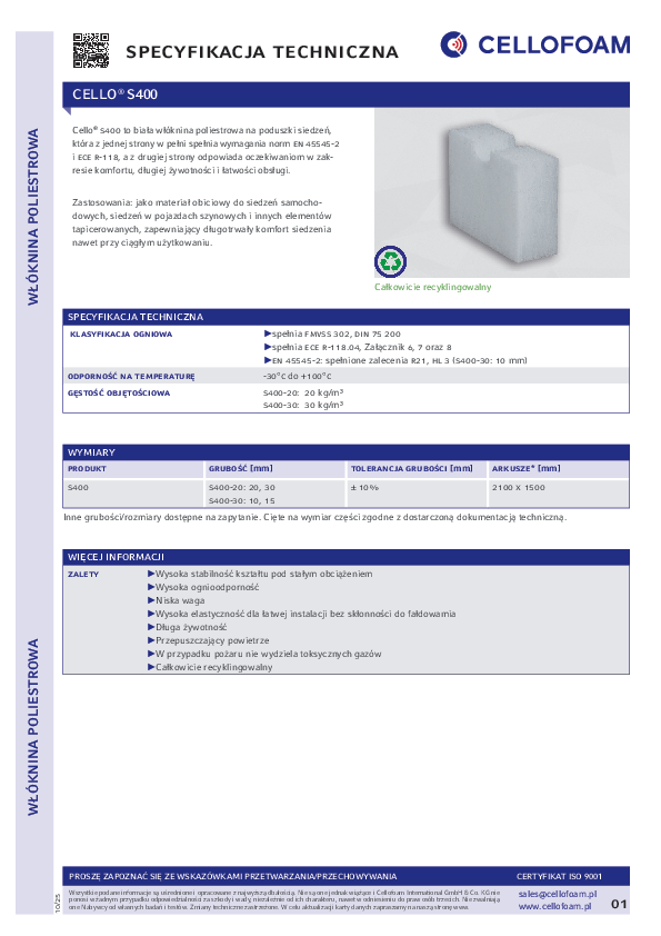Cello® S400 to biała włóknina na poduszki siedzeń, wykonana w 100% z włókien PET, która spełnia wszystkie wymagania norm EN 45545-2 i ECE R-118, a jednocześnie odpowiada oczekiwaniom w zakresie komfortu, długiej żywotności i łatwości obsługi.