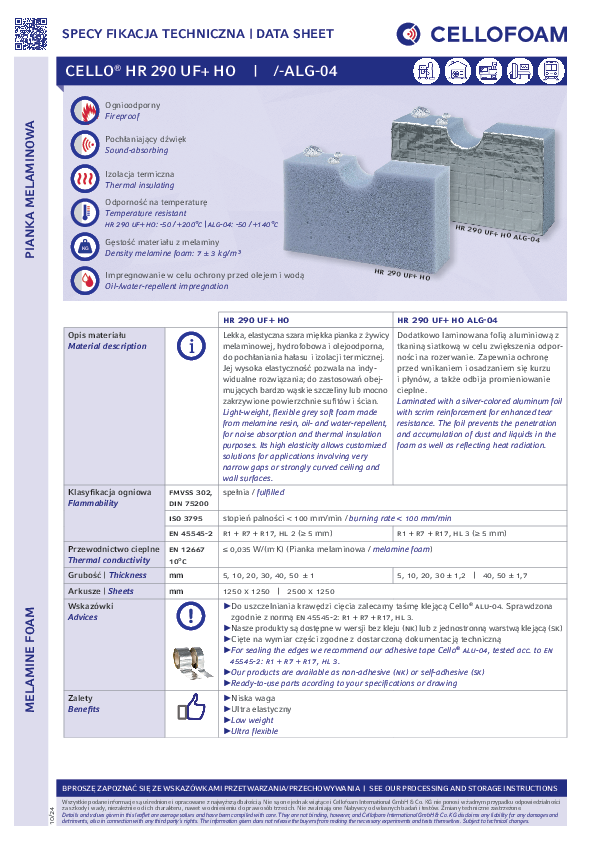 Cello® HR 290 UF+ HO to lekka, elastyczna szara miękka pianka z żywicy melaminowej (Basotect®), hydrofobowa i olejoodporna, do pochłaniania hałasu i izolacji termicznej. Jej wysoka elastyczność pozwala na indywidualne rozwiązania; do zastosowań obejmujących bardzo wąskie szczeliny lub mocno zakrzywione powierzchnie sufitów i ścian.