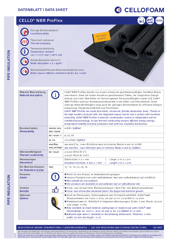 Cello® NBR ProFlex to czarna, zamkniętokomórkowa, elastyczna pianka elastomerowa. Dzięki dużej liczbie zamkniętych komórek, zintegrowanej barierze paroszczelnej i powierzchni o znakomitej emisyjności Cello® NBR ProFlex idealnie nadaje się do kontroli kondensacji w technologii chłodniczej i klimatyzacyjnej. Jego niska przewodność cieplna zapewnia efektywne oszczędzanie energii, stabilność temperatury i ochronę przed mrozem nawet przy małej grubości izolacji.Szczegóły produktu