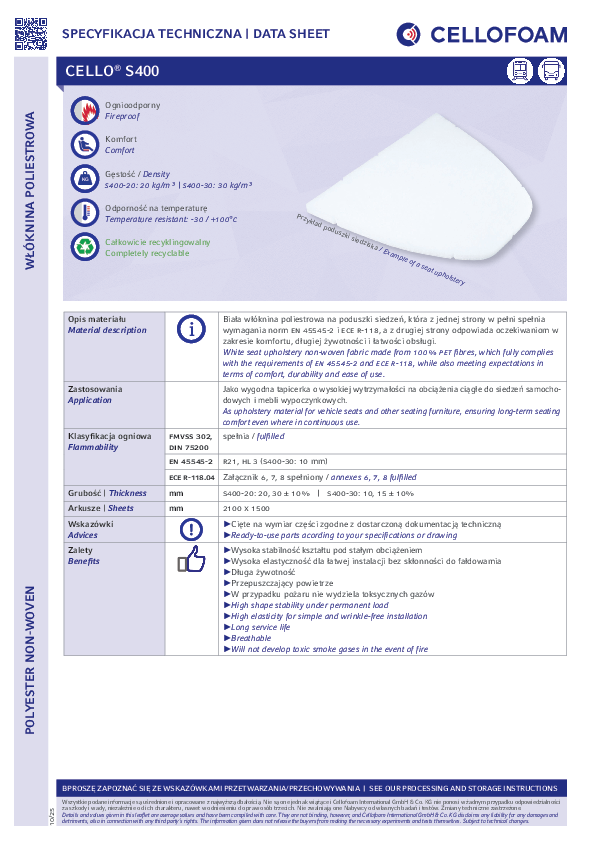 Cello® S400 to biała włóknina na poduszki siedzeń, wykonana w 100% z włókien PET, która spełnia wszystkie wymagania norm EN 45545-2 i ECE R-118, a jednocześnie odpowiada oczekiwaniom w zakresie komfortu, długiej żywotności i łatwości obsługi.