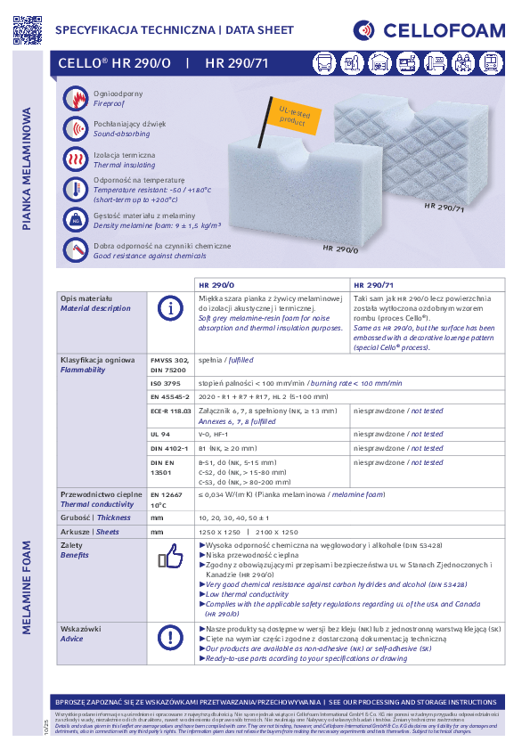 Jasnoszare tworzywo piankowe na bazie żywicy melaminowej (Basotect®) o przepuszczającej powietrze, lekko zagęszczonej powierzchni. Zaletą Cello® HR 290/71 jest atrakcyjny pod względem wizualnym wzór w romby, jak również duża odporność na wysokie temperatury.